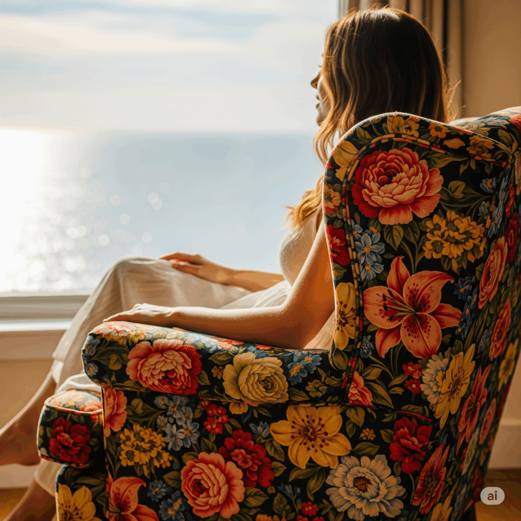 Ihre Mutter liebte es, den Sonnenuntergang am Nachmittag in diesem Sessel sitzend zu beobachten, stets begleitet von einem „leicht gesüßten Mokka auf dem kleinen Beistelltischchen“ neben ihr. Im Laufe der Jahre wurden viele Möbel im Haus erneuert, doch der „rosafarbene Blumensessel“ blieb immer an seinem Platz. Niemand hätte es gewagt, ihn umzustellen.
