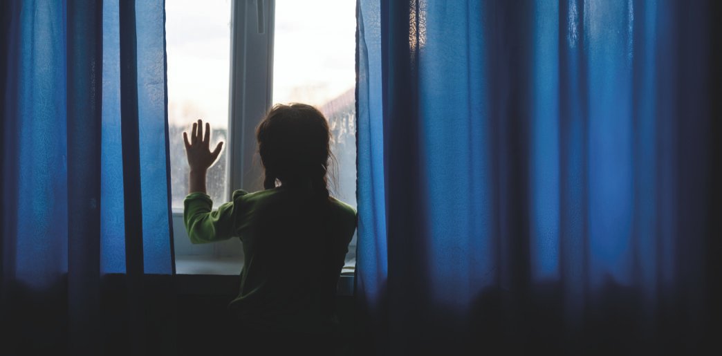 child girls are standing in the dark, looking out the window, sad mood